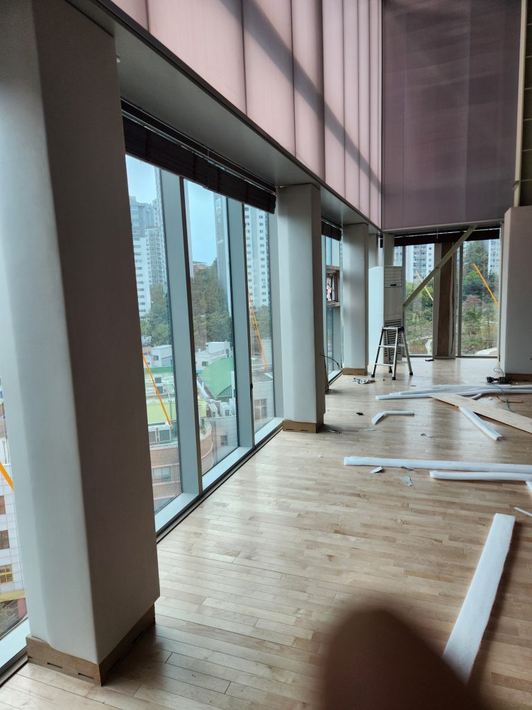 시공이 완료된 후, 기둥들은 완전히 새로운 모습으로 변화했습니다. 딱딱했던 원목 기둥은 안전가드로 덧입혀져 부드러운 쿠션감을 제공하며, 아이보리 톤의 마감은 실내 조명과 자연광을 반사하여 공간을 더욱 밝고 넓게 보이도록 합니다.