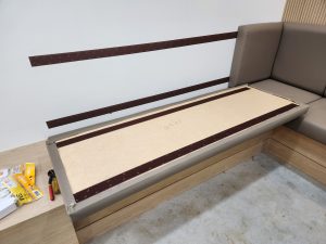 저희는 내구성이 뛰어나고 오염 관리가 쉬운 상급의 가죽 원단을 사용하여 붙박이쇼파 천갈이작업을 진행했습니다. 특히 이 현장은 등받이 두께를 두껍게 해서 편한 쇼파로 작업하였습니다.